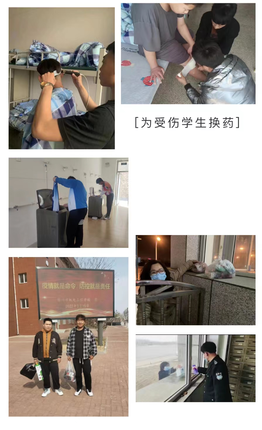 普通党员、老教师,在学校需要的时候,毫不犹豫主动请缨,用心观察学生思想动态,及时答疑解惑。这里有由原中层岗位退下的老同志,在组织需要时义无反顾的走在战“疫”的最前沿;有一对小夫妻推迟婚期,坚守岗位,认真完成领导交办的各项工作任务;有年轻教职工,舍小家顾大家,撑起学生管理的重任,落实各项防疫措施,无怨无悔;有近几十年党龄的两位食堂管理员,老退伍军人,为了让学生们吃好,心情舒畅的投入到学习中去,真可谓呕心沥血,兢兢业业,彰显军人本色。各位班主任虽身在校园之外,但时刻挂念封在校园内的学生,班主任与学生的时空连线持续不断,及时了解在校学生的思想、学习、生活需求,学生生病缺药,他们想方设法多渠道采购药品,多名教师自驾驱车 30余里,及时将生病学生所需药品送到学校。学校购买了洗衣机,有序组织为学生洗衣服。清明节按北方习俗组织住校值班老师为学生包酸菜馅饺子、学生以班级为单位自己动手包饺子等等。通过系列措施行为让学生感到学校的温暖、教职工的关怀。