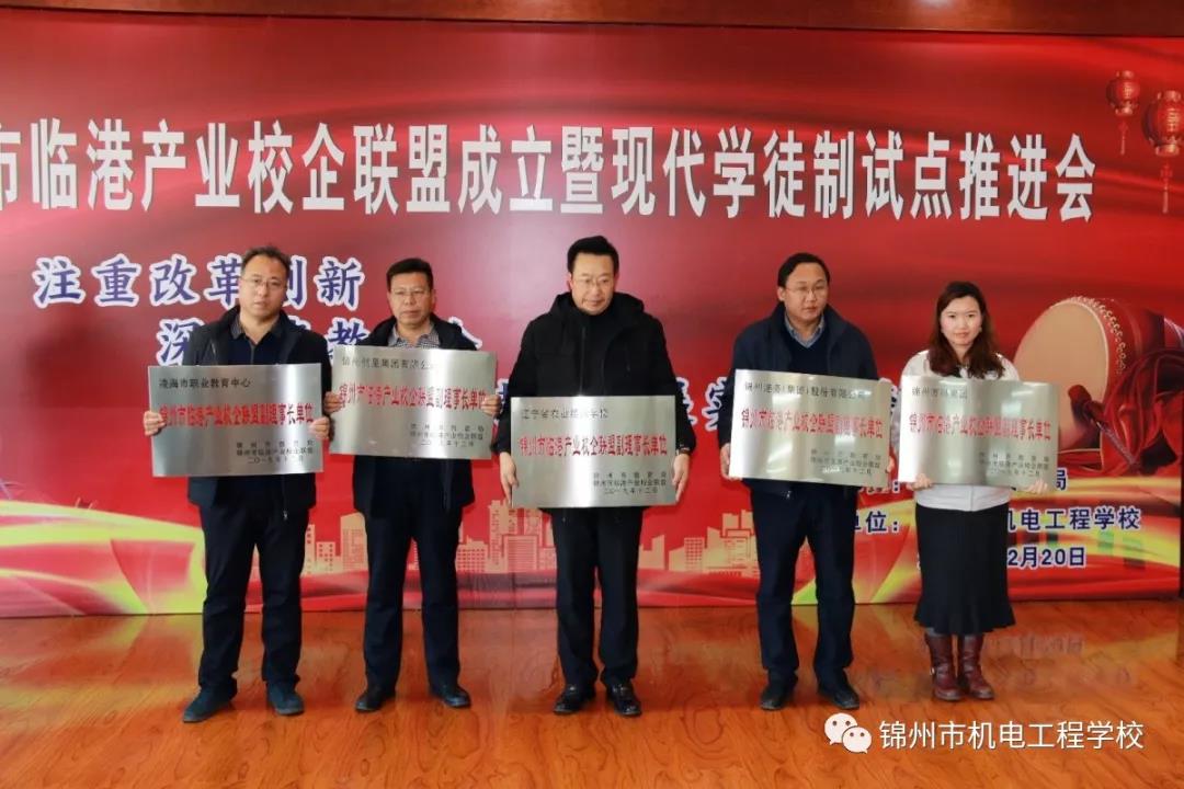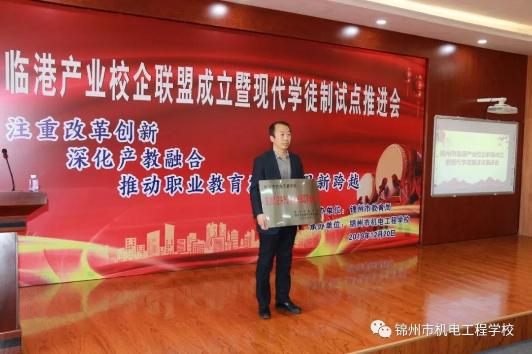 市教育局副局长刘发友给临港产业校企联盟理事长单位授牌。市教育局副局长刘发友与机电学校于东书记为副理事长单位授牌。联盟的成立标志着开启了锦州市临港产业以及职业教育事业跨越式发展的新征程。