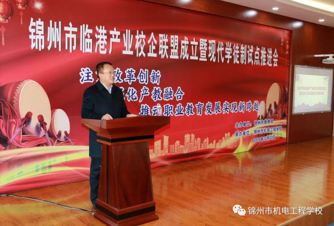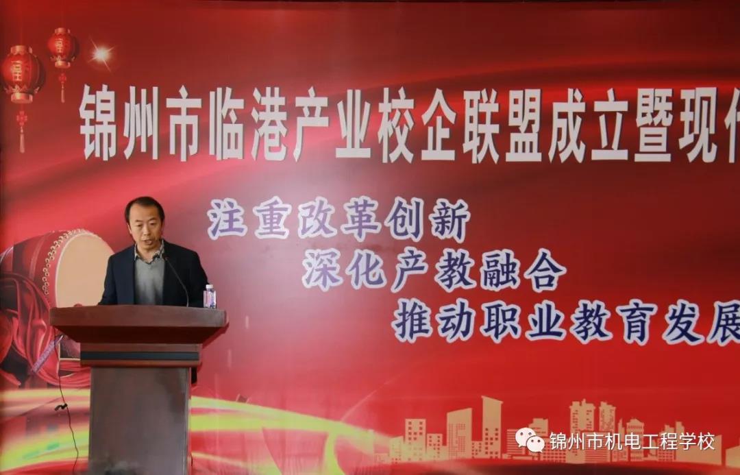 机电学校党委于东书记在大会上致辞,对与会的各位领导、嘉宾、成员单位代表表示欢迎,并表示将以牵头组建锦州市临港产业校企联盟为契机,继续深入推进校企协同育人,为锦州市临港产业及职业教育事业发展做出应有的贡献。